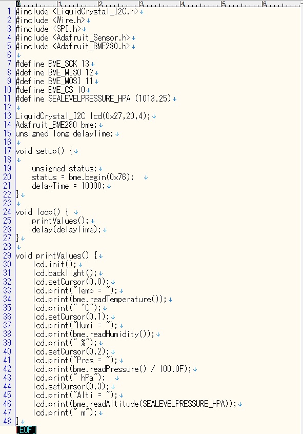Aduino UNO用にAmazonで購入した2004LCDモジュールをRaspberry Piで使ってみました。 このLCDモジュールは20文字x4行を表示できる大型のLCDで、i2c変換コントローラーHD44780が組み込まれています。 Raspberry Piとは4本のリード線でi2c接続します。(5V、GND、SDA、SCL) LED端子を短絡するとバックライトが点灯しますが、明るすぎるため200Ωの抵抗で接続しました。 Raspberry Pi Zero 2w(OS:Trixi 64bit)を利用しました。 i2cを有効化します。 #raspiconfig i2cのアドレスを確認します。 #i2cdetect -y 1 ![]() 「Raspberry Pi スターターキット第13回:I2C 1602 LCD(OSOYOO)」のサイトからpythonのサンプルプログラムをダウンロードします。 #wget http://osoyoo.com/driver/pi3_start_learning_kit_lesson_13/i2c1602_lcd.py i2c1602_lcd.pyのプログラムの一部を以下のように変更してLCD2004.pyにリネームします。 I2C_ADDR = 0x3F → I2C_ADDR = 0x27 LCD_WIDTH = 16 → LCD_WIDTH = 20 テスト用の表示プログラムlcdtest.pyを作成します。 ![]() LCD2004.pyとlcdtest.pyを同じディレクトリィに置いて実行権限を付し実行します。 #python3 lcdtest.py テスト文字が表示されました。 ### Arduino UNO R4 で使ってみました ### Arduino UNO R4 MINIMA とLCD2004、温湿度センサーBME280を使って温湿度計を作ってみました。 スケッチ(プログラム)はこんな感じです。 ![]() こういう工作にはOSがないマイコンが向いています。 |