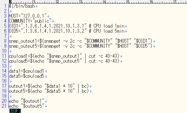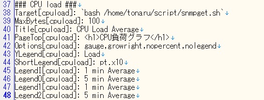 ===> mrtgのインストール : サーバの監視ツール(CPU温度) #apt-get install mrtg mrtgを出力するディレクトリィの作成 #mkdir /var/www/html/mrtg mrtg.cfg の編集 設定方法は、MRTG設定リファレンスを参照してください。 #vi /etc/mrtg.cfg WorkDir: /var/www/html/mrtg Language: japanese # CPU temperature Target[cputemp]: `cat /sys/class/thermal/thermal_zone0/temp|cut -c1-2 && cat /sys/class/thermal/thermal_zone0/temp|cut -c1-2 && echo && uname -n` MaxBytes[cputemp]: 70 Title[cputemp]: CPU Temp PageTop[cputemp]: <h1>CPU温度グラフ</h1> Options[cputemp]: gauge,growright,nopercent,nolegend YLegend[cputemp]: Temperature ShortLegend[cputemp]: ℃ LegendI[cputemp]: CPU温度 LegendO[cputemp]: CPU温度 Legend1[cputemp]: CPU温度 Legend2[cputemp]: CPU温度 #systemctl restart mrtg (追記)2024/10 新しいmrtgバージョンではmrtg.cfgの保存先が変更されていました。/etc/mrtg/mrtg.cfg mrtg の起動 #env LANG=C mrtg /etc/mrtg.cfg (追記)2024/10 #env LANG=C mrtg /etc/mrtg/mrtg.cfg 警告が出なくなるまで起動する。 ウェブブラウザで http://192.168.xx.xx/mrtg/cputemp.html を開いて動作確認をします。 (追記)2024/10 5分ごとに定期起動しないので、/etc/cron.d を見てみると新しいバージョンではmrtg が生成されていませんでした。 このため、crontabに実行コマンドを記述しました。 #crontab -e */5 * * * env LANG=C mrtg /etc/mrtg/mrtg.cfg > /dev/null 2>&1 なお、デーモンモードを有効化するとmrtgの定期起動ができます。 mrtg.cfgに次の2行を追加します。 RunAsDaemon: Yes Interval: 5 (5分間隔の場合) (追記)2026/1 CPU負荷をMRTGで監視してみました。 1分平均および5分平均のCPU負荷をsnmpを利用して取得します。 snmpd、snmpのインストール #apt install snmpd snmp snmpd.confを編集します。 #vi /etc/snmp/snmpd.conf rocommunity public default -V systemonly rocommunity6 public default -V systemonly の2行をコメントアウトします。 rocommunity6 public localhost を1行追加します。 snmpdをリロードします。 #systemctl reload snmpd CPU負荷データが取得できるか確認します。 #snmpget -v 2c -c public localhost .1.3.6.1.4.1.2021.10.1.3.1 mrtg.cfgを編集します。 #vi /etc/mrtg/mrtg.cfg 以下を追加します。 ### CPU load ### Target[cpuload]: .1.3.6.1.4.1.2021.10.1.3.1&.1.3.6.1.4.1.2021.10.1.3.2:public@localhost MaxBytes[cpuload]: 2 Title[cpuload]: CPU Load Average PageTop[cpuload]: <h1>CPU負荷グラフ</h1> Options[cpuload]: gauge,growright,nopercent,nolegend YLegend[cpuload]: Load ShortLegend[cpuload]: pt. LegendI[cpuload]: 1 min Average LegendO[cpuload]: 5 min Average Legend1[cpuload]: 1min Average Legend2[cpuload]: 5min Average #systemctl restart mrtg 以上の設定でグラフを描かせてみましたが、CPU負荷の値が平常時には 1より小さいためかグラフには 1か 0かの表示となりました。 MRTGで扱われる数値は整数のため、1より小さい数値は四捨五入されてしまうようです。 このため、snmpで取得したCPU負荷のデータを10倍する以下のシェルスクリプトを作成し、この出力値をMRTGに使用することにしました。 (snmpget.sh) ![]() (mrtg.cfg) ![]() |