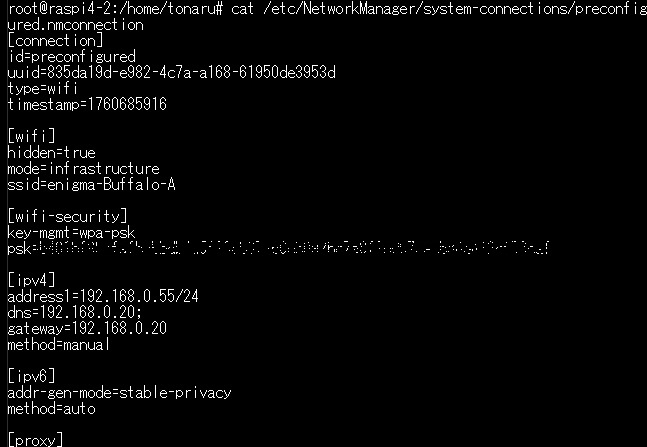 久しぶりにRaspberry Pi OS bookwormをインストールしてIPアドレスを固定化するために/etc/dhcpcd.confを編集しようとしましたが、そのファイルが見つかりませんでした。ネットで調べてみるとbookwormから固定IPアドレスの設定方法が変更されたようです。Raspberry Pi OS bookwormからネットワーク設定がdhcpcdではなくLinux標準のNetworkManagerになったようです。 ネットワークインターフェースは nmcli コマンドで設定できます。 #nmcli connection show ネットワークインターフェースの状況が表示されました。 nmcli modify コマンドによりネットワーク設定ができますが、今回はネットワーク設定ファイルを直接編集する方法でIPアドレスを固定化してみました。 /etc/NetworkManager/system-connectios/xxxxx.nmconnectionを以下のように編集します。xxxxxはWiFiのSSIDです。Raspberry Pi Imager等でSSIDを設定した場合は、preconfigured.nmconnectionとなります。 #ls /etc/NetworkManager/system-connections #vi /etc/NetworkManager/system-connections/xxxxx.nmconnection [ipv4]の行の下のmode=autoをmode=manualに変更します。そして、 address1=192.168.0.85/24,192.168.0.20 を追加します。192.168.0.85 は固定化したいIPアドレスで、192.168.0.20 はデフォルトゲートウェイ(ルーター)のIPアドレスです。さらに、dns=192.168.0.20を追加します。192.168.0.20はルーターのIPアドレスです。 #reboot IPアドレスが変更されたか確認しておきます。 #ifconfig ![]() |