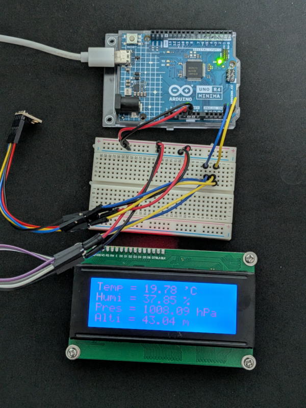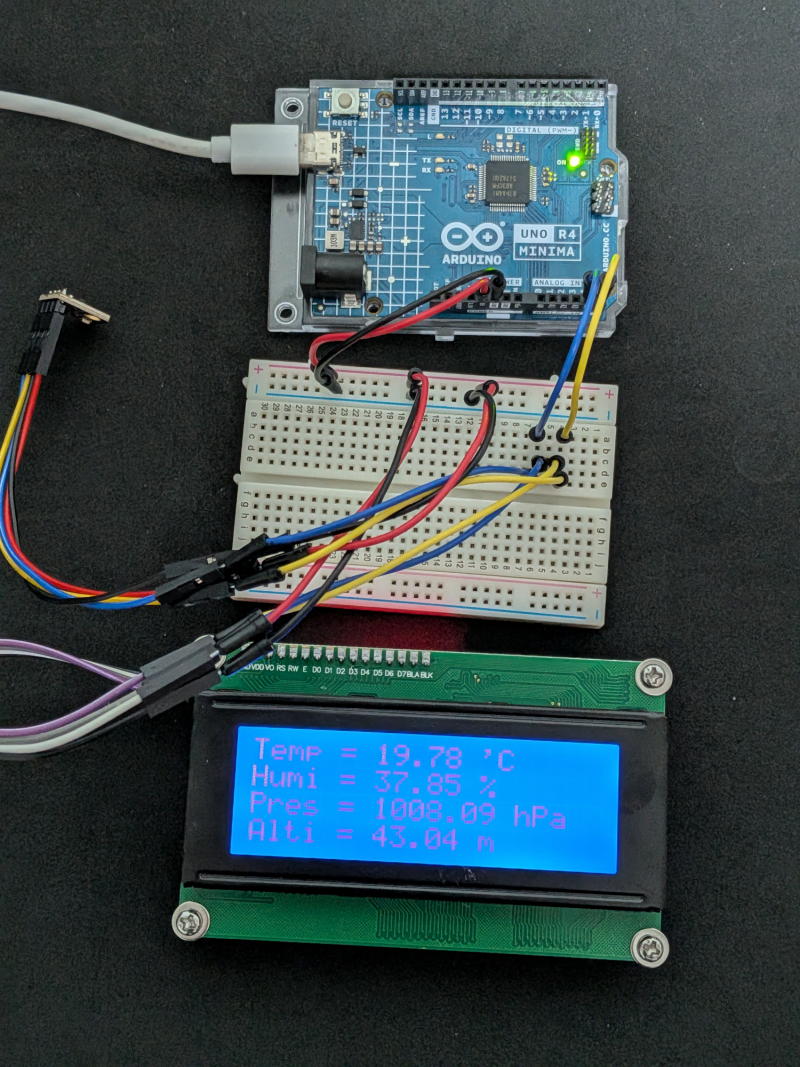 Aduino UNO用にAmazonで購入した2004LCDモジュールをRaspberry Piで使ってみました。 このLCDモジュールは20文字x4行を表示できる大型のLCDで、i2c変換コントローラーHD44780が組み込まれています。 Raspberry Piとは4本のリード線でi2c接続します。(5V、GND、SDA、SCL) LED端子を短絡するとバックライトが点灯しますが、明るすぎるため200Ωの抵抗で接続しました。 Raspberry Pi Zero 2w(OS:Trixi 64bit)を利用しました。 i2cを有効化します。 #raspiconfig i2cのアドレスを確認します。 #i2cdetect -y 1 ![]() 「Raspberry Pi スターターキット第13回:I2C 1602 LCD(OSOYOO)」のサイトからpythonのサンプルプログラムをダウンロードします。 #wget http://osoyoo.com/driver/pi3_start_learning_kit_lesson_13/i2c1602_lcd.py i2c1602_lcd.pyのプログラムの一部を以下のように変更してLCD2004.pyにリネームします。 I2C_ADDR = 0x3F → I2C_ADDR = 0x27 LCD_WIDTH = 16 → LCD_WIDTH = 20 テスト用の表示プログラムlcdtest.pyを作成します。 ![]() LCD2004.pyとlcdtest.pyを同じディレクトリィに置いて実行権限を付し実行します。 #python3 lcdtest.py テスト文字が表示されました。 ### Arduino UNO R4 で使ってみました ### Arduino UNO R4 MINIMA とLCD2004、温湿度センサーBME280を使って温湿度計を作ってみました。 スケッチ(プログラム)はこんな感じです。 ![]() こういう工作にはOSがないマイコンが向いています。 |