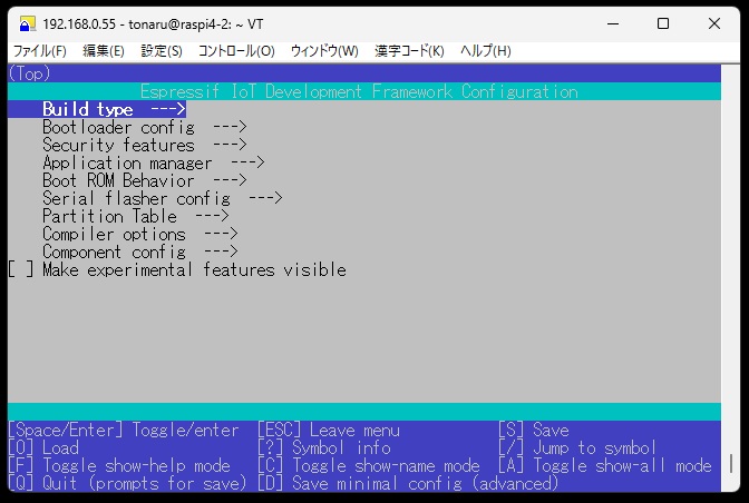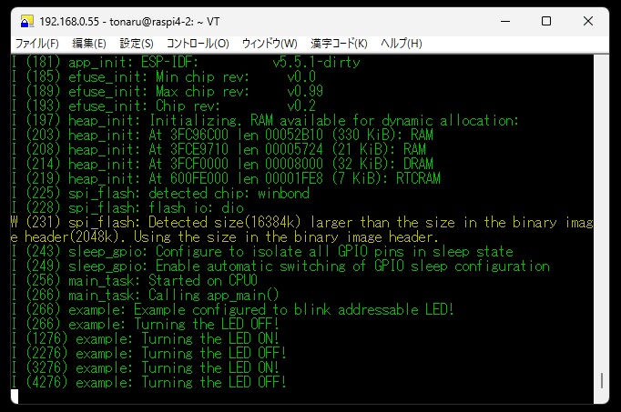 AliexpressでRaspberry Pi Pico2互換のLCD付きマイコンボードRP2350-LCD-1.47Aを購入しようとしたところ、間違って形がよく似ているESP32-S3-LCD-1.47Bを購入してしまいました。両者の性能は似ていますが、ESP32の方はWiFiとBluetoothが内蔵されているのでいろんな用途に使えそうです。 とりあえず試用してみようとWindows PCにESP-IDFという開発ツールをインストールしましたが、このソフトは使用方法が難解ですぐには使えそうにありません。 そこで、ネット上に「ESP-IDFのRaspberry Piへのセットアップ」という記事があったので、これを参考にESP-IDFのLinux版をインストールして試してみました。 今回使用したRaspberry Pi 4のOSはTrixiです。 ESP-IDFインストールに必要なパッケージをインストールします。 #apt install flex bison gperf cmake ccache libffi-dev libssl-dev dfu-utilgit wget python3 python3-pip python3-venv ninja-build libusb-1.0-0 (斜体文字のパッケージは既にインストールされてました) ESP-IDFをインストールするディレクトリを作成しそのディレクトリに移動します。 #mkdir -p ~/esp #cd ~/esp rootでログインしているので/root/espがインストールディレクトリです。 次に、「ESP-IFD Versions」ページで最新バージョンを確認します。 2026年1月時点での最新バージョンはv5.5.1です。 #git clone -b v5.5.1 --recursive https://github.com/espressif/esp-idf.git ESP-IDFで使用される関連ツールをインストールするスクリプトを実行します。 #cd ~/esp/esp-idf #./install.sh esp32 インストールした関連ツールのパスを通すスクリプトを実行します。 #. $HOME/esp/esp-idf/export.sh (ドットと$の間に半角スペースがあります) (注)このスクリプトはターミナルを起動する度に実行する必要があります。 これでESP32の開発環境のセットアップは完了です。 /root/esp/esp-idf/examples/get-stsrted/にサンプルプロジェクトがあるので、これをビルドしてESP32-S3-LCD-1.47Bにプログラムを書き込んでみます。 「blink」をサンプル利用してみます。 blinkをespディレクトリ直下にコピーします。 #cd ~/esp #cp -r $IDF_PATH/examples/get-stsrted/blink 次に、ESP32-S3-LCD-1.47Bとraspberry PiをUSBで接続するシリアル通信デバイス名を特定するためUSBの抜き差しをします。 USBを抜く前と後に次のコマンドを実行します。 #ls /dev/tty* ![]() devリストを比較して、Raspberry Piが認識しているデバイス名が/dev/ttyACM0と特定できました。 続いてプロジェクトの構成設定をします。 プロジェクトがあるディレクトリに移動します。 #cd ~/esp/blink プロジェクトのターゲットを設定します。 #idf.py set-target esp32-s3 さらにプロジェクトの各種設定を行うにはmenuconfig画面を起動し、この画面で設定します。 #idf.py menuconfig (Escキーで終了) ![]() 今回はmenuconfigu画面による設定は不要です。 プログラムをビルドします。 #idf.py build プログラムをESP32-S3-LCD-1.47Bに書き込みます。 #idf.py -p /dev/ttyACM0 flash (認識しているデバイス名) ESP32-S3-LCD-1.47BのLEDが点滅すれば成功です。 なお、次のコマンドでプログラムの実行状況がモニタできます。 #idf.py -p /dev/ttyACM0 monitor ![]() モニタの終了は Ctrl + ] です 他にESP32-S3-LCD-1.47用のサンプルプロジェクトがここのサイトにあります。 「ESP32-S3-LCD-1.47 Demo」をクリックしてESP32-S3-LCD-1.47-Demo.zipファイルダウンロードします。 このzipファイルを解凍してできたESP32-S3-LCD-1.47-Testをフォルダー丸ごと/root/espディレクトリの直下にコピーします。 そして、blinkプロジェクトと同じ手順でターゲットの設定、ビルド、ボードへの書き込みを行います。 #cd ~/esp/ESP32-S3-LCD-1.47-Test #idf.py set-target esp32-s3 #idf.py build #idf.py -p /dev/ttyACM0 flash このサンプルプログラムは、ボードのLEDの色が変化しSDカードに保存した画像をLCDに表示します。 |