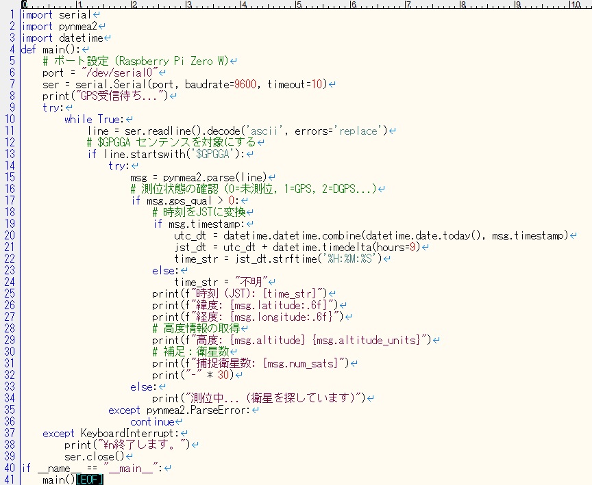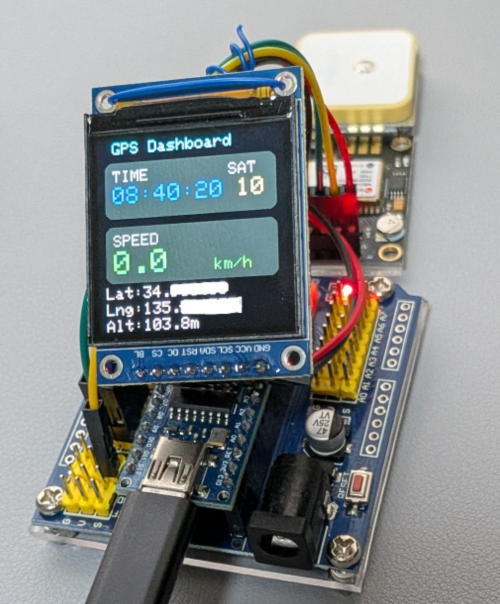 安価なGPSモジュールGY-GPSV3-NEO6MをRaspberry Pi Zero W (bullseye)を使用し使ってみました。 NEO6Mの端子VCC、GND、TXD、RXDをそれぞれRaspberry Piの5V、GND、GPIO15、GPIO14に接続します。 Raspberry Pi Zero Wではデフォルトでシリアルポートがシリアルコンソールとして使用されているため、これを解放します。 #raspi-config Interface Options → Serial Port "Would you like a login shell to be accessible over serial?" → No "Would you like the serial port hardware to be enabled?" → Yes 再起動 pythonプログラムを生成AIで作成します. ![]() ライブラリーのインストール #pip3 install pyserial pynmea2 pythonプログラムの実行 #python gps.py ![]() 時刻、緯度、経度、高度、捕捉衛星数が取得できました。 Arduino nanoでLCD表示するものも作ってみました。 |
