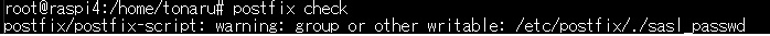 ===> postfix、dovecotのインストール : メールサーバ #apt-get install postfix SASL認証用にsasl2-binをインストール #apt-get install sasl2-bin OP25B対策のため自宅で利用しているプロバイダー(eo光)のメールサーバでメールリレーさせます。 (追記)2023/12 eoメールのセキュリティ強化実施により、独自のメールアドレスでのメールリレーがブロックされました。gmailメールリレーなどに変更が必要です。 「eoメールでのメールリレーができなくなった(postfix)」を参照してください。 saslの認証ファイルを作成 #vi /etc/postfix/sasl_passwd [smtpauth.eonet.ne.jp]:587 xxx@xxx.eonet.ne.jp:<passward> 作成した認証ファイルをpostfixに反映 #postmap /etc/postfix/sasl_passwd postfixのリロード #/etc/init.d/postfix reload 次にpostfixのmain.cfを変更 #vi /etc/postfix/main.cf myhostname = xxx.xxx (変更) mydestination = $myhostname, xxx.xxx, raspi3p, localhost.localdomain, localhost (変更) relayhost = [smtpauth.eonet.ne.jp]:587 (変更) mynetworks = 192.168.xxx.0/24, 127.0.0.1 (変更) mailbox_size_limit = 0 recipient_delimiter = + inet_interfaces = all inet_protocols = ipv4 (変更) home_mailbox = Maildir/ (追加) smtp_sasl_auth_enable = yes (追加) smtp_sasl_mechanism_filter = plain, login, cram-md5 (追加) smtp_sasl_password_maps = hash:/etc/postfix/sasl_passwd (追加) smtp_sasl_security_options = noanonymous (追加) 設定のチェック #postfix check (追記)2025/10 Trixie にインストールしたpostfixの設定をしていたら下記のエラーが出ました。 ![]() /etc/postfix/sasl_passwd のパーミッションが664となっていたので、これを644に変更したらエラーが解消しました。 #chmod 644 /etc/postfix/sasl_passwd postfixの再起動 #service postfix restart さらにpopサーバとしてdovecotをインストール #apt-get install dovecot-pop3d dovecot.confの編集 #vi /etc/dovecot/dovecot.conf listen = *, :: (コメントアウト) disable_plaintext_auth = no (追加) 10-mail.confの編集 #vi /etc/dovecot/conf.d/10-mail.conf mail_location = maildir :~/Maildir (変更) dovecotの再起動 #service dovecot restart (追記)2025/10 dovecot は Ver 2.4系から設定方法が大きく変更されています。 バージョンの確認方法は「#dovecot --version」です。 dovecot Ver 2.4系の設定は以下のとおりです。 10-mail.confの編集 #vi /etc/dovecot/conf.d/10-mail.conf mail_driver = mbox mail_home = /home/%{user|username} mail_path = %{home}/mail mail_inbox_path = /var/mail?%{user} 以上の4行をコメントアウト(#を付ける)する。 #mail_driver = maildir #mail_path = %{owner_home}/Maildir #mail_index_path = ~/Maildir/shared/%{owner_user} 以上の3行をアンコメント(#を外す)する。 設定内容の確認 #doveconf -n dovecotの再起動 #service dovecot restart 以上でメールサーバのインストールが完了しました。telnet コマンドまたはTunderbird等のメールソフトでメールの送受信テストをして動作確認をします。 telnet での確認方法は以下のとおりです。 #apt install telnet #telnet localhost 25 mail from: <ユーザー名> rcpt to: <ユーザー名> data <メールの中身を記述> . (ドットで終了) quit #telnet localhost 110 user <ユーザー名> pass <パスワード> list retr 1 (listで表示されたmail番号を指定すると、送信したmailの中身が表示される) quit メールエイリアスの設定 root宛のメールをユーザーに転送できるようメールエイリアスを設定しておきます。 #vi /etc/aliases root: user1 (追記) #newaliases |
